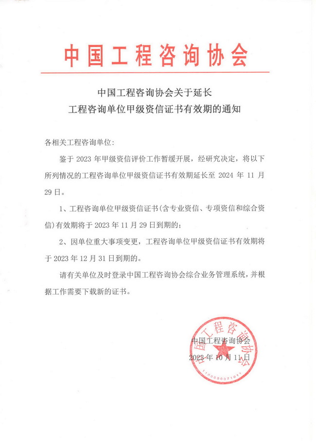 中國(guó)工程咨詢協(xié)會(huì)關(guān)于延長(zhǎng)工程咨詢單位甲級(jí)資信證書有效期的通知