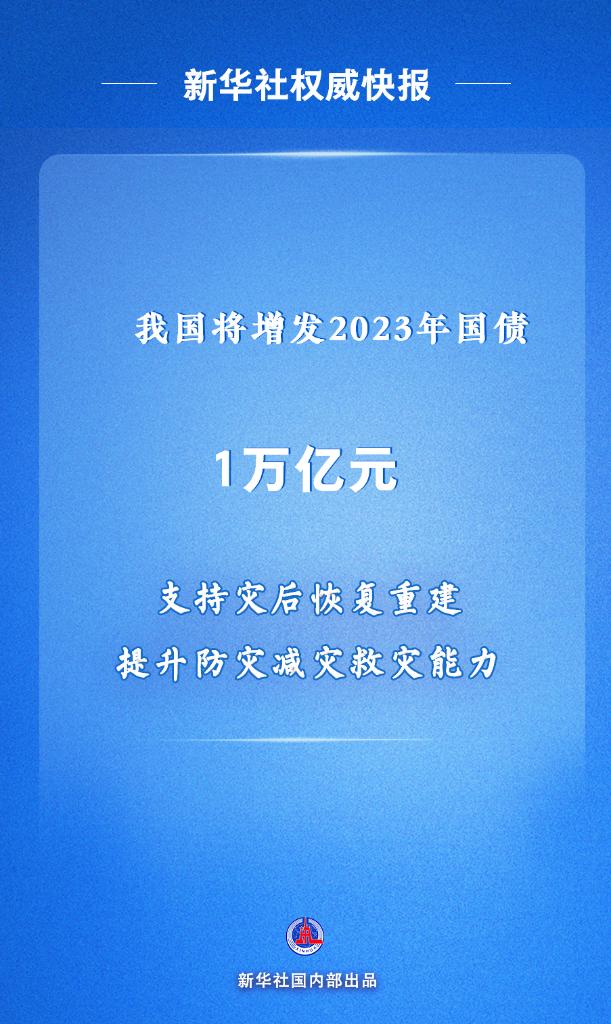 | 新華社北京10月24日電 中央財政將在今年四季度增發(fā)2023年國債10000億元,增發(fā)的國債全部通過轉(zhuǎn)移支付方式安排給地方,集中力量支持災(zāi)后恢復(fù)重建和彌補防災(zāi)減災(zāi)救災(zāi)短板,整體提升我國抵御自然災(zāi)害的能力。 24日,十四屆全國人大常委會第六次會議表決通過了全國人民代表大會常務(wù)委員會關(guān)于批準國務(wù)院增發(fā)國債和2023年中央預(yù)算調(diào)整方案的決議,明確了上述安排。